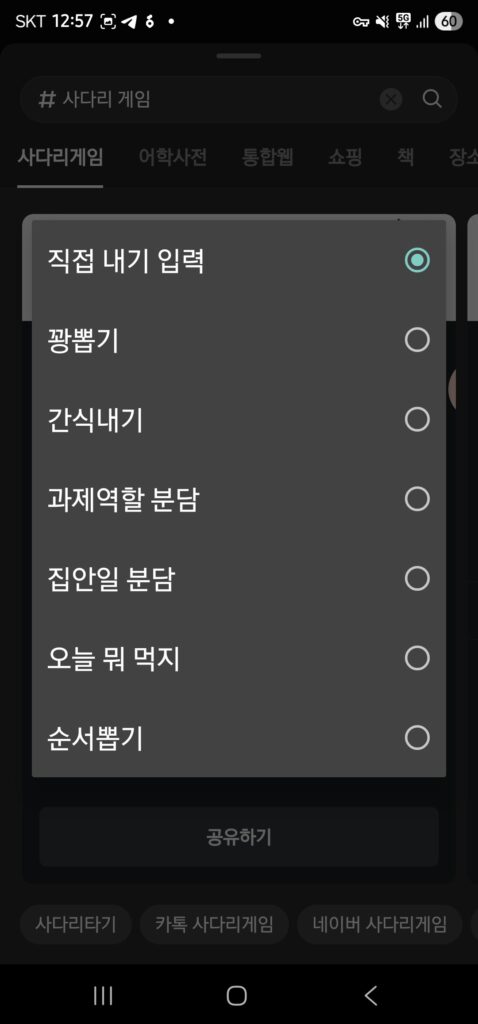 ‘사다리’, ‘사다리타기’, ‘내기’ 등으로 검색하면 관련 기능이 나타납니다. -