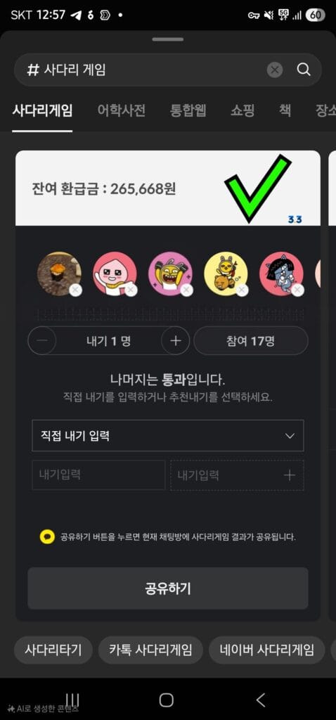 설정 후 ‘공유하기’ 누르면 채팅방에 사다리 게임이 올라오며, ‘전체 결과 보기’를 눌러 확인할 수 있습니다.